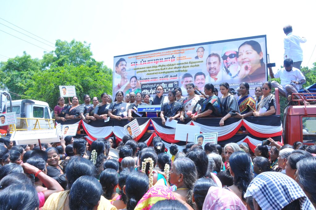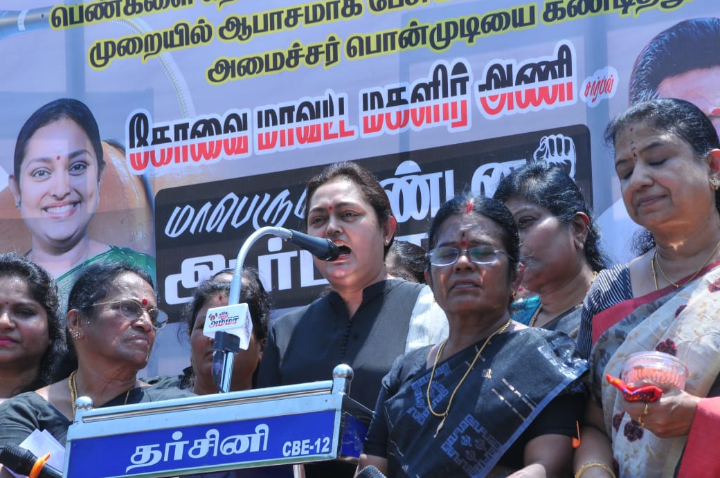 கோவை செஞ்சிலுவை சங்கம் அருகில் இன்று கோவை மாவட்ட அ.தி.மு.க மகளிர் அணி சார்பில், தி.மு.க அரசை கண்டித்தும், அமைச்சர் பொன்முடியை பதவி விலக கண்டன ஆர்ப்பாட்டம் நடந்தது. கூட்டத்தில் அ.தி.மு.க தலைமை கழக பேச்சாளர் நடிகை விந்தியா பேசினார்.