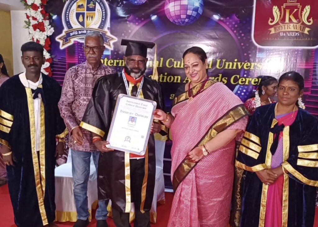 விருதுநகர் மாவட்டம் சிவகாசி அருகே உள்ள விஜயகரிசல் குளத்தைச் சேர்ந்த கண்ணன் கடந்த 20 ஆண்டுகளாக முழுநேர சமூக சேவையில் ஈடுபட்டதற்காக சமூக சேவருக்கான டாக்டர் பட்டம் வழங்கப்பட்டுள்ளது.