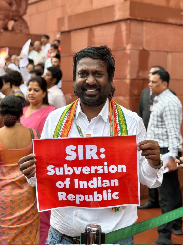 பாராளுமன்ற வளாகத்தில் இந்திய கூட்டணி சகாக்களுடன் பீகாரில் நடைபெற்ற வாக்கு திருட்டை கண்டித்து நடைபெற்ற ஆர்ப்பாட்டத்தில் SIR என்ற பெயரில் இணைந்தோம்.