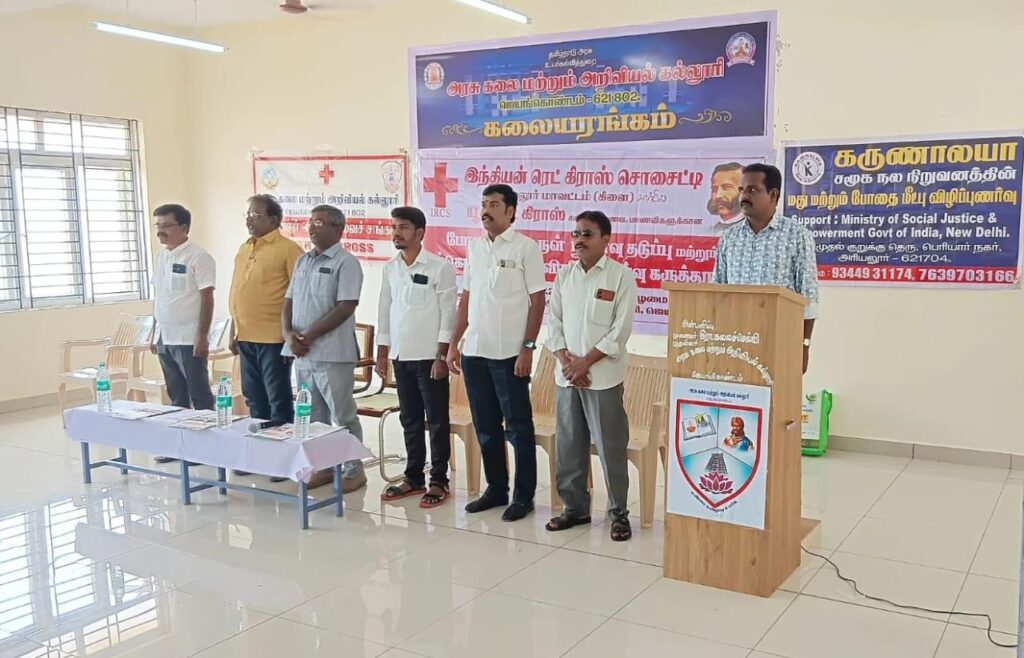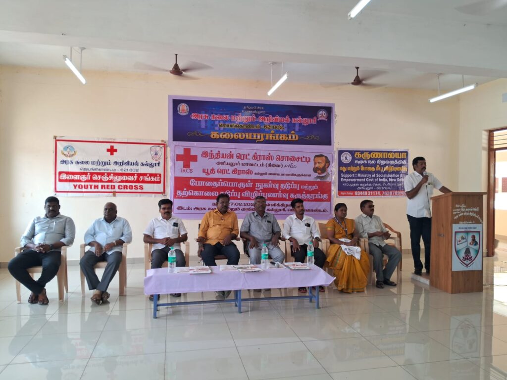 அரியலூர் மாவட்ட இந்தியன் ரெட் கிராஸ் சொசைட்டி, மாவட்ட கிளையின் யூத் ரெட் கிராஸ் சார்பில் ஜெயங்கொண்டம், அரசு கலை மற்றும் அறிவியல் கல்லூரியில்,கல்லூரி மாணவ, மாணவிகளுக்கு போதைப்பொருள் நுகர்வு தடுப்பு மற்றும் தற்கொலை தடுப்பு விழிப்புணர்வு கருத்தரங்கு நேற்று நடைபெற்றது.