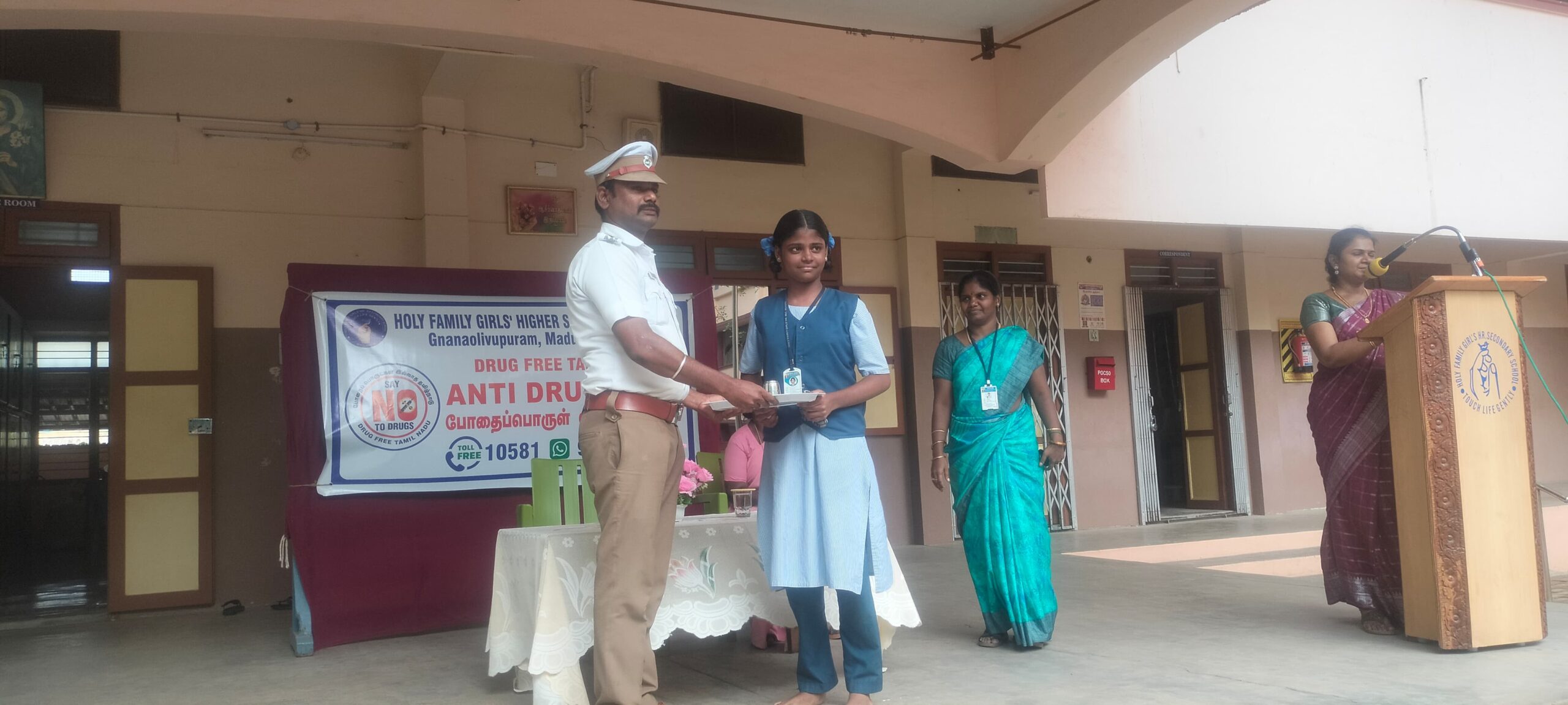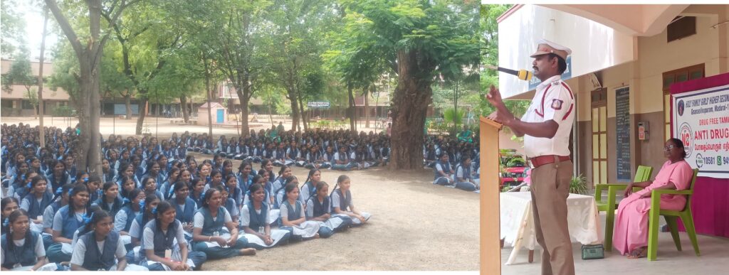 அதன் ஒரு பகுதியாக மதுரை மாநகர காவல் துறையின் சார்பாக ஆரப்பாளையம் பகுதியில் அமைந்துள்ள ஹோலி பேமிலி தனியார் பெண்கள் மேல்நிலைப் பள்ளியில் மாணவியர்களுக்கு போதைபொருள் எதிர்ப்பு மற்றும் பெண்களுக்கு எதிரான குற்றங்களை தடுக்கும் வழிமுறைகளை பற்றிய விழிப்புணர்வினை திலகர் திடல் போக்குவரத்து காவல் ஆய்வாளர் அ.தங்கமணி வழங்கினார். உடன் பள்ளி தலைமை ஆசிரியை ஜெயராணி.. மற்றும் ஆசிரியைகள் 300க்கும் மேற்பட்ட மாணவர்கள் கலந்து கொண்டனர்.