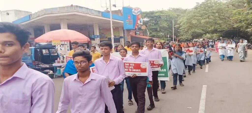 சுமார் 500க்கும் மேற்பட்ட பள்ளி மற்றும் கல்லூரி மாணவர்கள் கலந்து கொண்ட விழிப்புணர்வு நடை பயணமானது போதைப்பொருள் எதிர்ப்பு கோஷங்களை எழுப்பியவாறு அண்ணா சாலை, காந்தி வீதி, ரயில் நிலையம் வழியாக சென்று கடற்கரை சாலை காந்தி சிலை அருகே நிறைவடைந்தது.