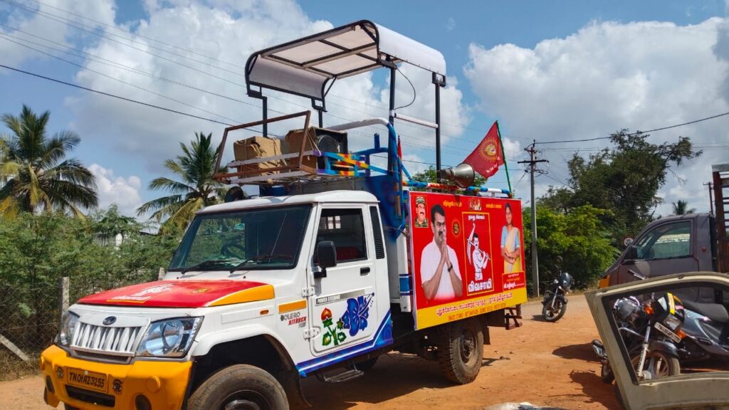 இந்த நிலையில் தான் மற்ற வேட்பாளர்கள் யார் என்றும் தெரியவில்லை யார் எங்கு பிரச்சார வாகனங்களை தயார் செய்கிறார்கள் என்பதெல்லாம் தெரியாத நிலையில் புதுக்கோட்டை நாம் தமிழர் கட்சியின் வேட்பாளர் எழிலரசி புதுக்கோட்டையில் இருந்து அறந்தாங்கி செல்லும் சாலையில் உள்ள கைக்குறிச்சி என்ற இடத்தில் ஒரு லேத் பட்டறையில் தேர்தல் வாக்கு சேகரிப்பு பரப்புரை வாகனம் திறந்த நிலையில் இருக்குமாறும் அதற்கு மேல் நிழல் தரும் வகையில் மூடி போட்டு வெயில் தாக்காத அளவிற்கு தயார் செய்து வருகிறார். நான்கு நாட்களாக இந்த பணி நடைபெற்று வருகிறது. சுமார் 15,000 ரூபாய் செலவில் இந்த வண்டி புணரமைக்கப்படுவதாக தெரிய வருகிறது.