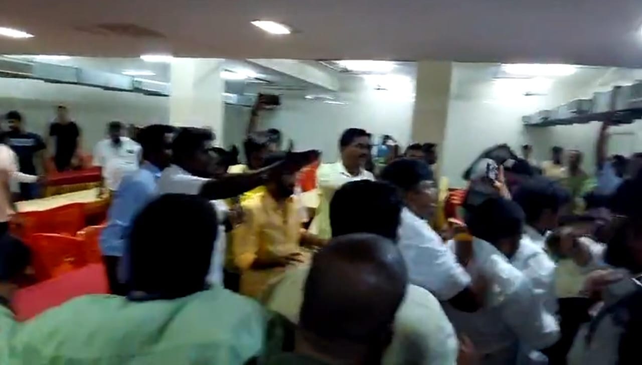 திண்டுக்கல்லில் எடப்பாடி பழனிச்சாமி தலைமையில் நடந்த கூட்டத்தில் கட்சி நிர்வாகிகள் சாப்பிட சென்ற போது அனுமதிமறுக்கப்பட்டதால் பிரச்சனை ஏற்பட்டது.
