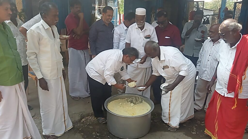 அனைவருக்கும் பொங்கல் வழங்கினார். அருகில் இந்திய தேசிய லீக் நிர்வாகிகள் முஹம்மதுகான், முத்து விலாசா, முகமது காசிம் ஷேக், பரீத் ஜிந்தாசா, ஆகியோர் கலந்து கொண்டனர்.