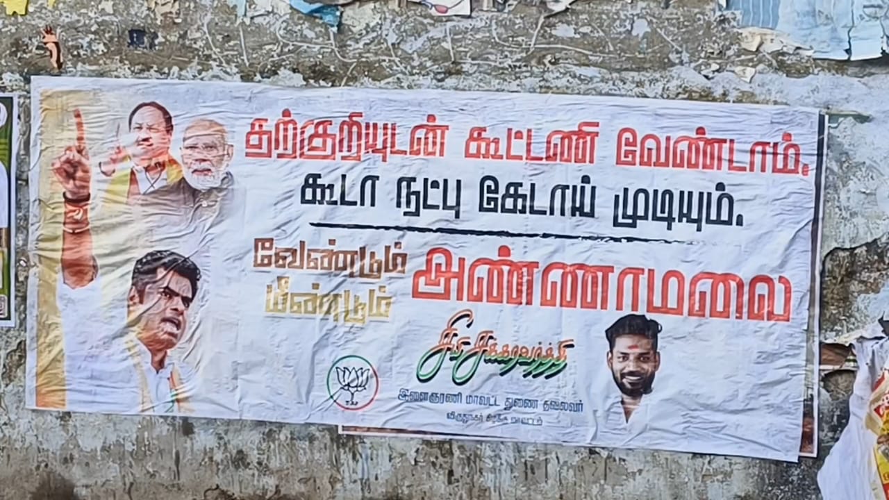 ஒட்டப்பட்டுள்ள இப்போஸ்டரில் “தற்குரியுடன் கூட்டணி வேண்டாம்” (அதிமுக) “கூடா நட்பு கேடாய் முடியும்”-“வேண்டும் மீண்டும் அண்ணாமலை” என்ற வாசகங்கள் மற்றும் பிரதமர் மோடி, பாஜக தேசியத் தலைவர் ஜேபி நட்டா, தமிழக பாஜக தலைவர் அண்ணாமலை ஆகியோரின் புகைப்படங்கள் போஸ்டரில் இடம் பெற்றுள்ளது.
