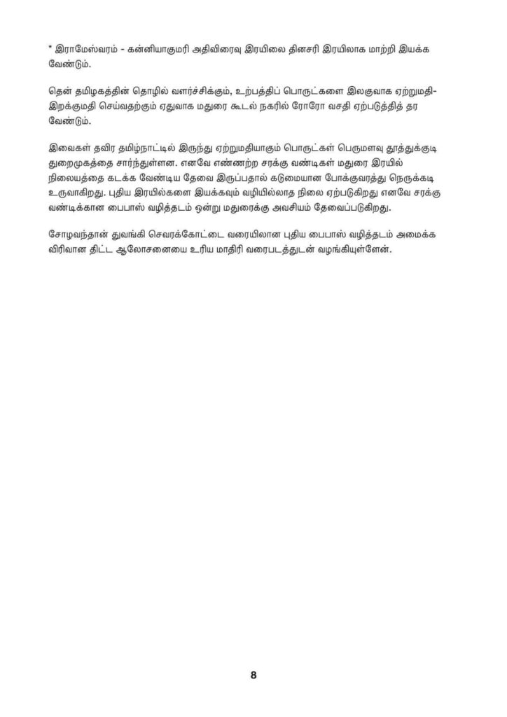 • மதுரை – தூத்துக்குடி புதிய இரயில் பாதை (ஏற்கனவே அங்கீகரிக்கப்பட்டுள்ளது) விரைவாக செயல்படுத்தப்பட வேண்டும்.