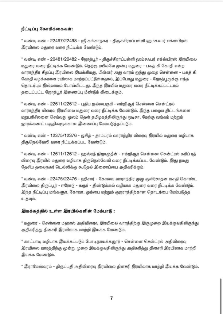 ஆனால், மதுரைக் கோட்டத்தின் தலைமையிடமாக இருந்தாலும், வெறும் 5 பயணிகள் இரயில் மட்டுமே இங்கு இயக்கப்படுகிறது…மாறாக, கோவை, சேலம் மற்றும் திருச்சிராப்பள்ளி கோட்டங்களில் தலா 20-க்கும் மேற்பட்ட பயணிகள் ரயில்களும் இயக்கப்படுகின்றன. தொடர்ந்து பயணிக்கும் பொதுமக்களின் நலன் கருதி, மதுரையிலிருந்து மேலும் 5 பயணிகள் ரயில்களை பின்வரும் வழித்தடங்களில் இயக்க பரிசீலிக்குமாறு கேட்டுக்கொள்கிறேன்.