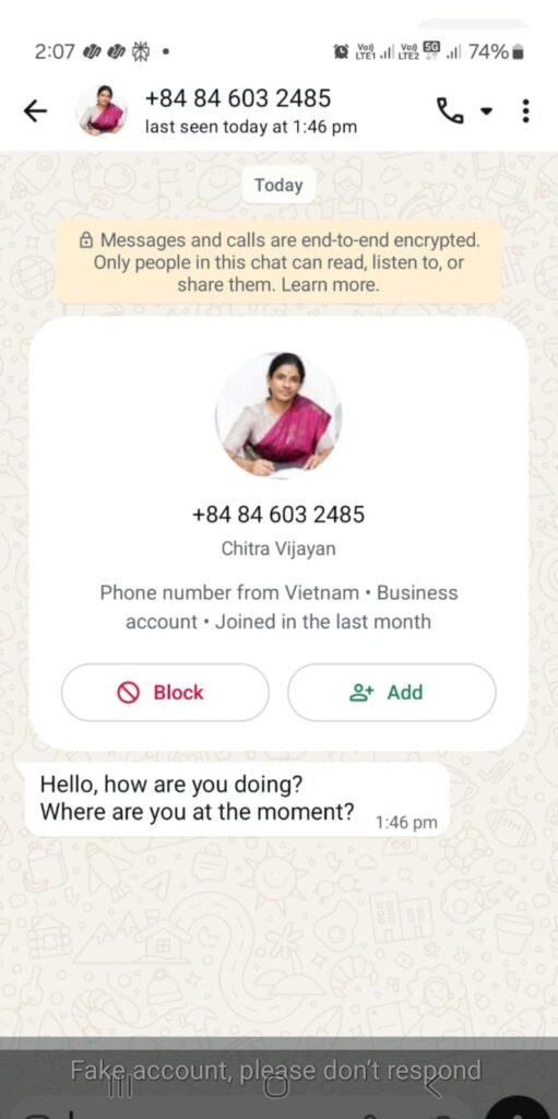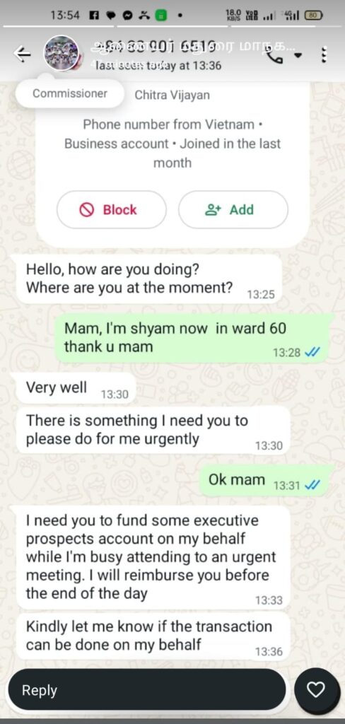 மதுரை மாநகராட்சியின் ஆணையாளராக உள்ள சித்ரா விஜயன் உருவப் படத்தோடு போலியான ஒரு வாட்ஸ் அப் உருவாக்கப்பட்டு தனக்கு அவசரத் தேவை இருப்பதாகவும் உதவி கேட்டும் நூதன முறையில் பணம் பறிக்க முயற்சி