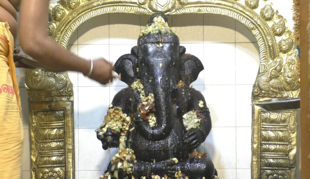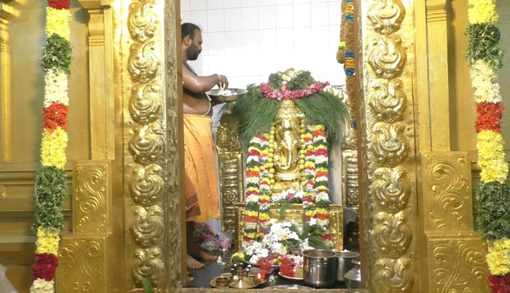 அதை தொடர்ந்து மூலவர் கணபதிக்கு ஆலயத்தில் சிவாச்சாரியார் பட்டாடை உடுத்தி, தங்க கவசம் அணிவித்த பிறகு உதிரிப்பூக்களால் நாமாவளிகள் கூறினார்.