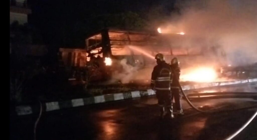 ஆம்னி பஸ் முழுவதும் எறிந்து எலும்புக்கூடாக காட்சியளித்தது.