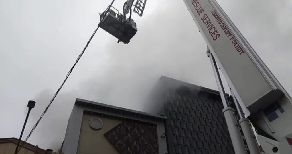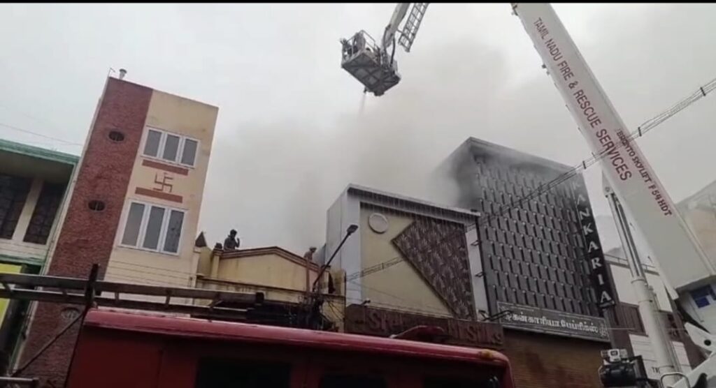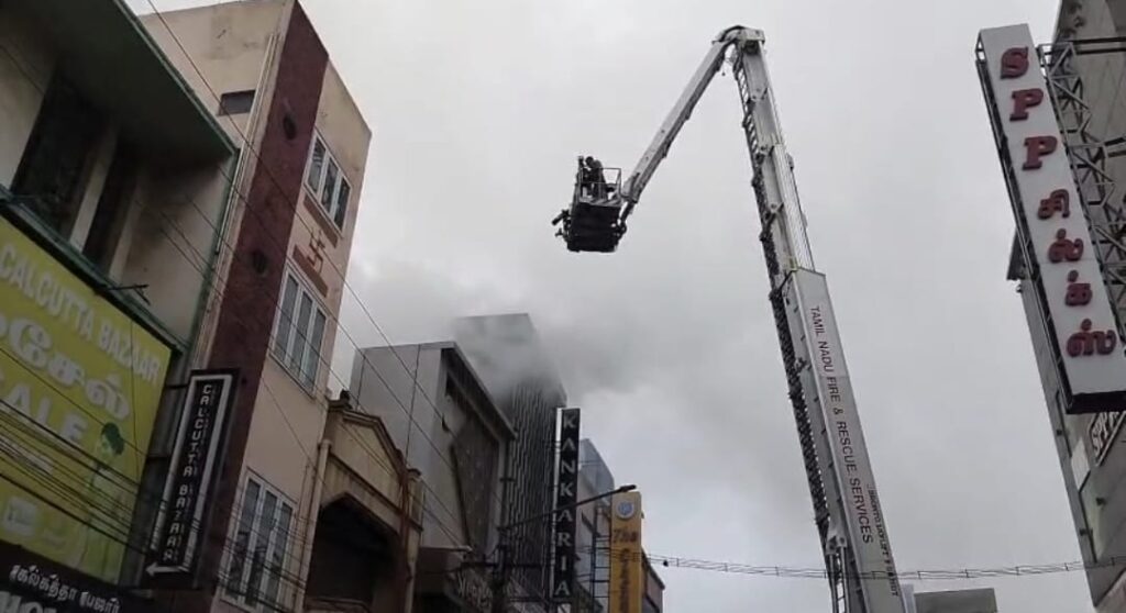 சம்பவ இடத்துக்கு விரைந்து வந்த தீயணைப்பு துறையினர் தீயை அணைக்கும் பணியில் ஈடுபட்டு உள்ளனர். இரண்டாவது மாடியில் தீ பற்றி இருக்கும் நிலையில் கிரேன் உதவியுடன் தீயை அணைக்கும் பணியில் தீயணைப்பு துறையினர் ஈடுபட்டு வருகின்றனர்.