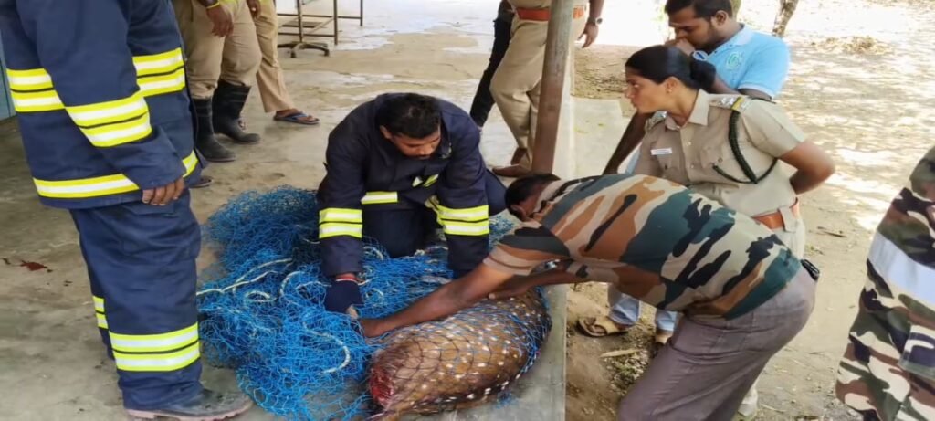 விபத்தில் சிக்கிய மானை மீட்டு சிகிச்சைக்கு கொண்டு சென்ற தீயணைப்புத் துறையினர்…