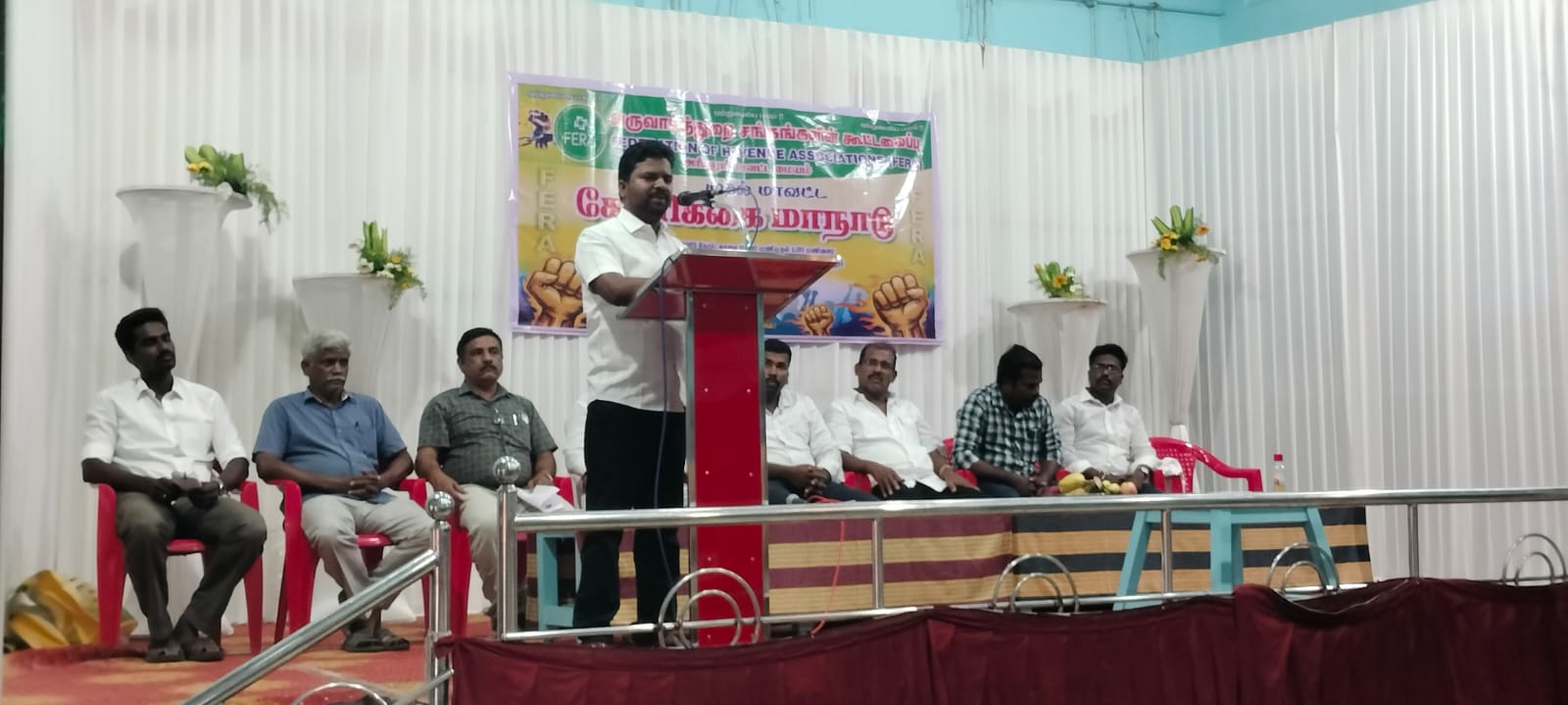 அரியலூர் பிஎன்எம் திருமண மஹாலில் வருவாய்த்துறை சங்கங்களின் கூட்டமைப்பு (FERA), அரியலூர் மாவட்ட மையத்தின் சார்பில் முதல் மாவட்ட கோரிக்கை மாநாடு நடைபெற்றது.தமிழ்நாடு வருவாய்த்துறை அலுவலர் சங்கத்தின் மாநில பொருளாளர் சோமசுந்தரம் சிறப்பு அழைப்பாளராக கோரிக்கை மாநாட்டில் கலந்து கொண்டு, சங்க கொடியினை ஏற்றி மாநாட்டினை துவக்கி வைத்து, சிறப்புரையாற்றினார்.