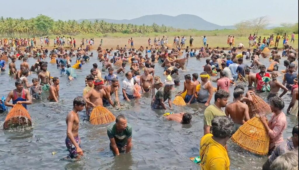 திண்டுக்கல் மாவட்டம் நத்தம் அருகே சிறுகுடி ஊராட்சிக்கு உட்பட்ட எட்டையம்பட்டி கிராமத்தில் 50 ஏக்கர் பரப்பளவில் பெரிய கண்மாய் உள்ளது. இங்கு ஆண்டுதோறும் கண்மாயில் நீர் வற்றியவுடன் ஊர் சார்பில் மீன் பிடி திருவிழா நடத்துவது வழக்கம்.