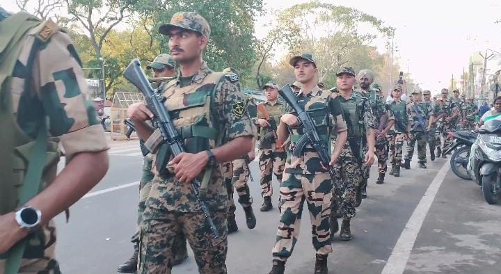 இதில் வஜ்ரா வாகனம் உள்ளிட்ட காவல்துறை வாகனங்களுடன் சேர்ந்து போலீஸ் இன்ஸ்பெக்டர்கள் சப் இன்ஸ்பெக்டர்கள், போலீசார் மற்றும் மற்றும் துணை ராணுவ படையினரும் கலந்து கொண்டனர்.