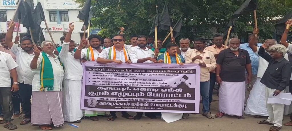 காரைக்கால் புதிய பேருந்து நிலையம் அருகில் நடைபெற்ற கருப்பு கொடி ஏந்தி குரல் எழுப்பும் போராட்டத்தில் காரைக்கால் மக்கள் போராட்ட குழுவினர் அன்சாரிபாபு, பன்னீர்செல்வம், சூர்யா உள்ளிட்ட பல்வேறு அரசியல் கட்சிகளை சேர்ந்த 100க்கும் மேற்பட்டோர் கலந்து கொண்டு கண்டன முழக்ககளை எழுப்பி போராட்டத்தில் ஈடுட்டனர்.