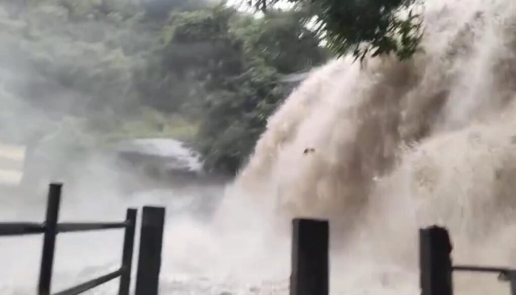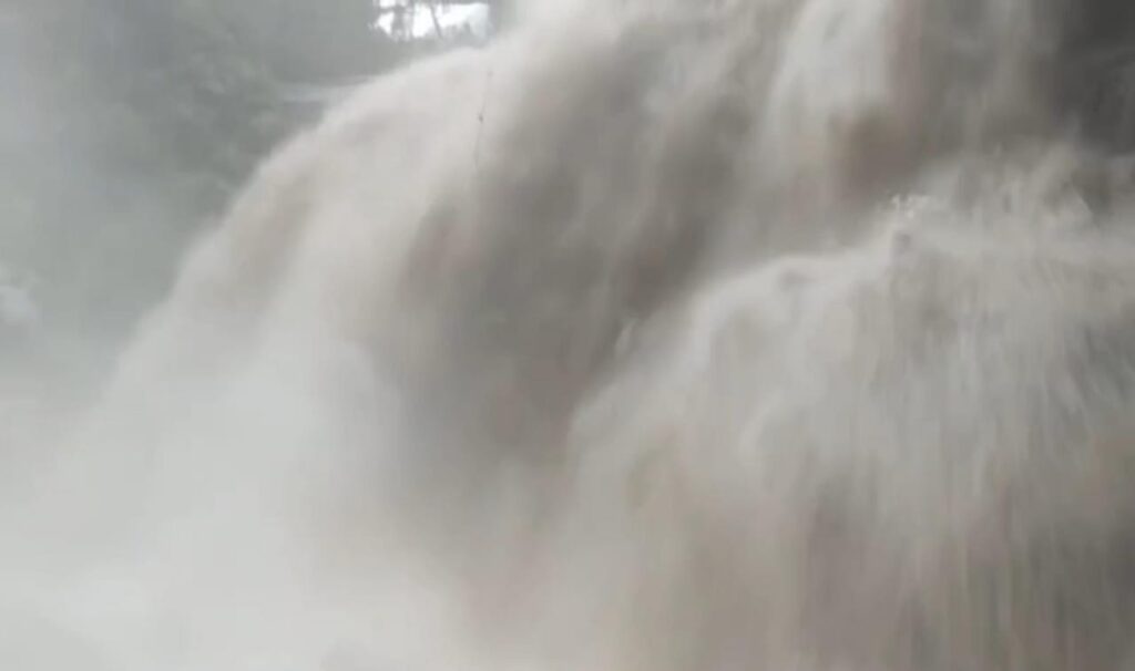 குறிப்பாக அருவியில் செந்நிறத்தில் காட்டாற்று வெள்ளம் போல் கரைபுரண்டு தண்ணீர் ஓடுவதோடு அருவியில் தண்ணீர் நிரம்பி அருவிக்கு செல்லக்கூடிய படிக்கட்டுகள் வழியாக தண்ணீர் வழிந்தோடி வருகிறது.