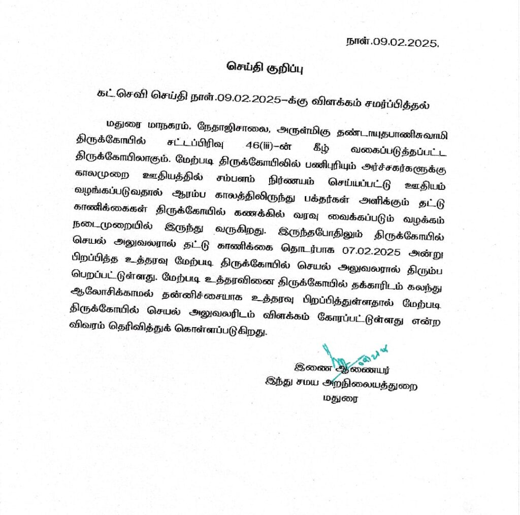 இருந்தபோதிலும் திருக்கோயில் செயல் அலுவலரால் தட்டு காணிக்கை தொடர்பாக 07.02.2025 அன்று பிறப்பித்த உத்தரவு மேற்படி திருக்கோயில் செயல் அலுவலரால் திரும்ப பெறப்பட்டுள்ளது. மேற்படி உத்தரவினை திருக்கோயில் தக்காரிடம் கலந்து ஆலோசிக்காமல் தன்னிச்சையாக உத்தரவு பிறப்பித்துள்ளதால் மேற்படி திருக்கோயில் செயல் அலுவலரிடம் விளக்கம் கோரப்பட்டுள்ளது எனவும் கூறப்பட்டுள்ளது.