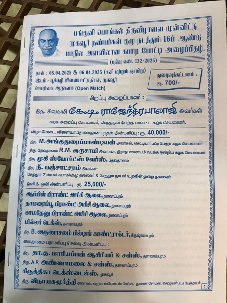 நிகழ்ச்சிக்கு சிறப்பு அழைப்பாபளராக அதிமுக மேற்கு மாவட்ட கழக செயலாளரும், முன்னாள் அமைச்சருமான கே.டி.ராஜேந்திர பாலாஜி கலந்து கொண்டு கபடி போட்டியினை தொடங்கி வைக்க, வருகை தருமாறு கோரிக்கை விடுத்தனர்.