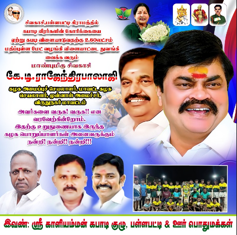 விருதுநகர் மாவட்டம் சிவகாசி அருகே உள்ள பள்ளபட்டி கிராமத்தில் கபடி போட்டியை ஊக்குவிப்பதற்காக முன்னாள் அமைச்சரும் அதிமுக மேற்கு மாவட்ட கழக செயலாளருமான கே.டி.ராஜேந்திர பாலாஜி கபடி குழுவினர் கோரிக்கை ஏற்று கபடி போட்டியை நேரில் பார்வையிடுவதற்காக சென்றார்.