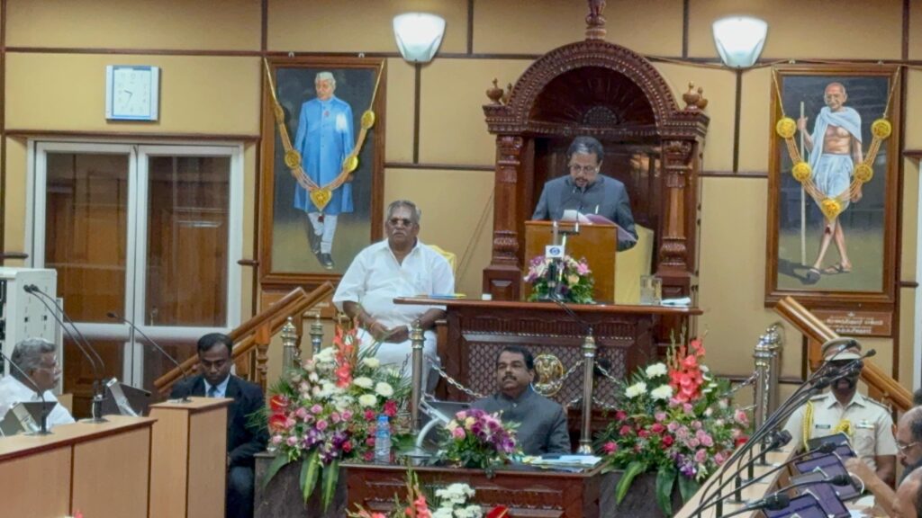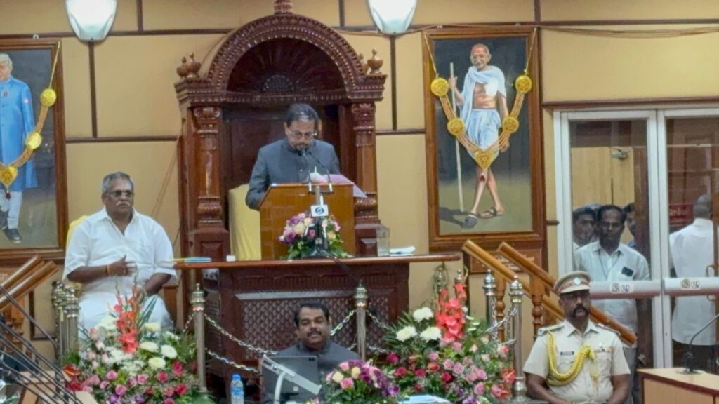 தொடர்ந்து, சபாநாயகர் செல்வம் பூங்கொத்துக் கொடுத்த வரவேற்று சட்டமன்றத்திற்கு அழைத்துச் சென்றனர். தொடர்ந்து தமிழ்த்தாய் வாழ்த்து இசைக்கப்பட்டு திருக்குறளுடன் துணைநிலை ஆளுநர் கைலாஷ் நாதன் தனது உரையை தொடங்கினார்.