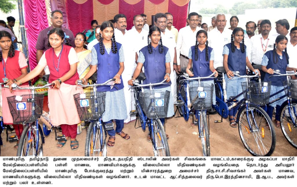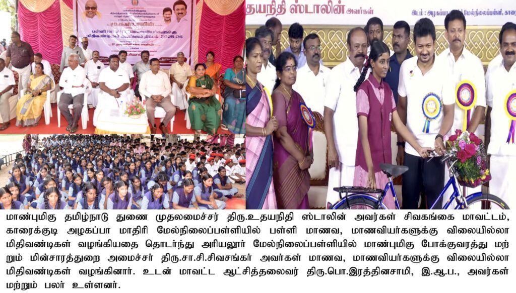 தமிழ்நாடு துணை முதலமைச்சர் உதயநிதி ஸ்டாலின்,குழந்தைகள் தின விழாவினை முன்னிட்டு சிவகங்கை மாவட்டம், காரைக்குடி அழகப்பா மாதிரி மேல்நிலைப் பள்ளியில் பள்ளி மாணவ, மாண வியர்களுக்கு விலையில்லா மிதிவண்டிகள் வழங்கியதை தொடர்ந்துஅதன் நேரடி காணொளி காட்சி அரியலூர் மேல்நிலை ப்பள்ளியில் ஒளிபரப்பப்பட்டது.