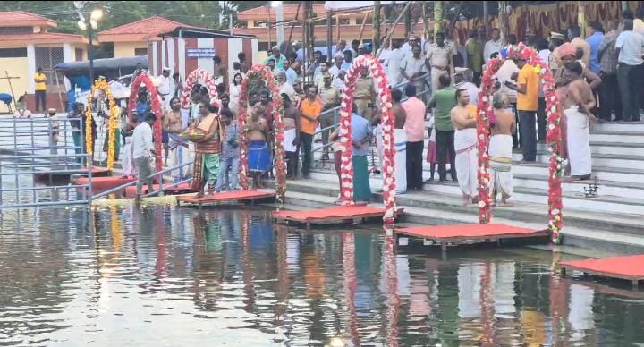 வரும் மார்ச் 6-ஆம் தேதி காலை 8.24 மணிக்கு சனீஸ்வர பகவான் கும்ப ராசியில் இருந்து மீன ராசிக்கு பிரவேசிக்கிறார். இந்நிலையில் சனிப்பெயர்ச்சிக்கு முன்னதாக திருநள்ளாறு நளத்தீர்த்த குளத்தில் சப்த நதிகளான கங்கா யமுனா கோதாவரி கிருஷ்ணா உள்ளிட்ட நதிகளில் இருந்து எடுத்துவரப்பட்ட புனித நீரை நளத்தீர்த்த குளத்தில் கலந்து கங்கா ஆரத்தி நடைபெற்றது.