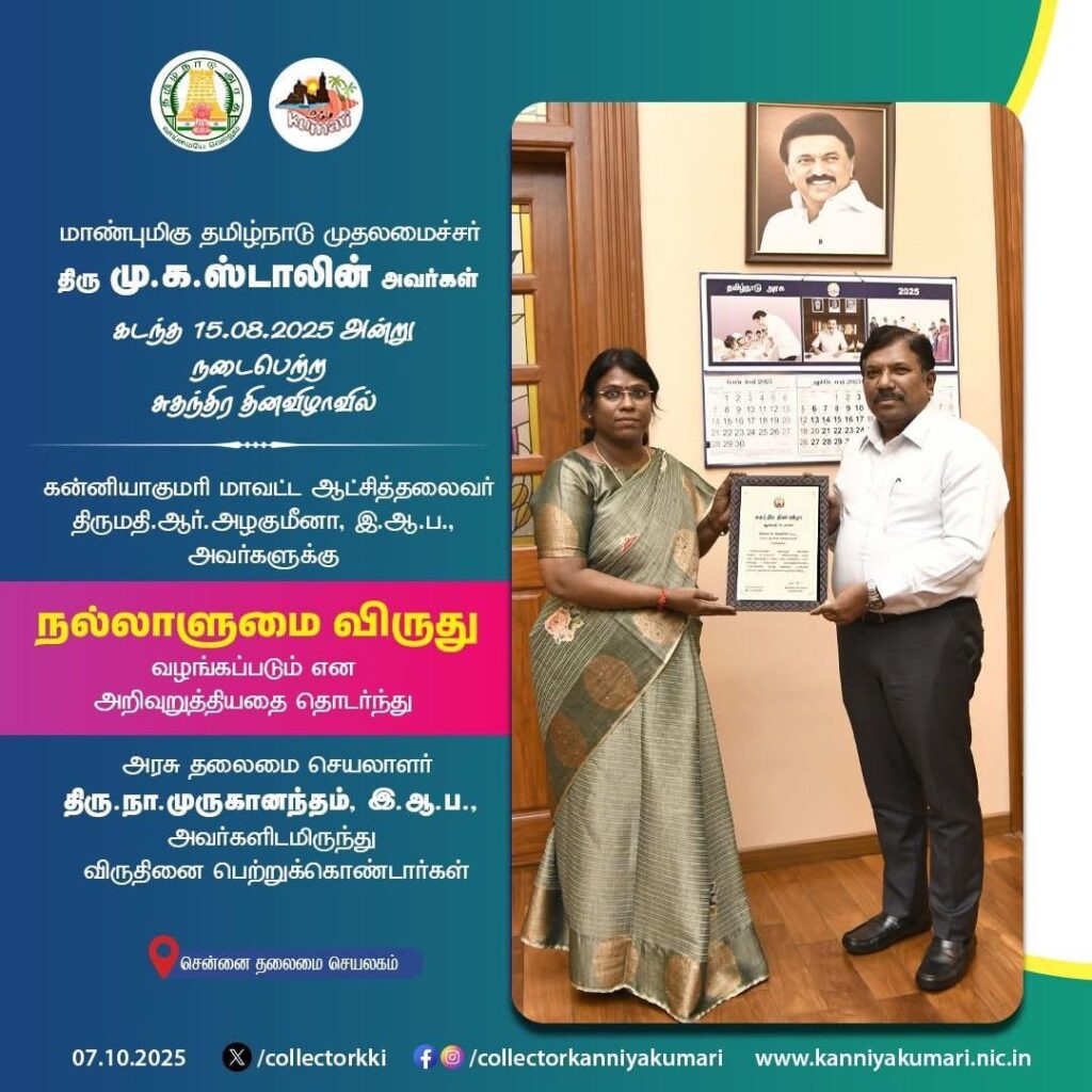 தமிழ்நாடு முதலமைச்சர் அவர்கள் கடந்த 15.08.2025 அன்று நடைபெற்ற சுதந்திர தினவிழாவில் கன்னியாகுமரி மாவட்ட ஆட்சித்தலைவர் ஆர்.அழகுமீனா, அவர்களுக்கு நல்லாளுமை விருது வழங்கப்படும் என அறிவுறுத்தியதை தொடர்ந்து, 07.10.2025 அன்று சென்னை தலைமை செயலகத்தில் அரசு தலைமை செயலாளர் நா.முருகானந்தம், அவர்களிடமிருந்து விருதினை பெற்றுக்கொண்டார்.