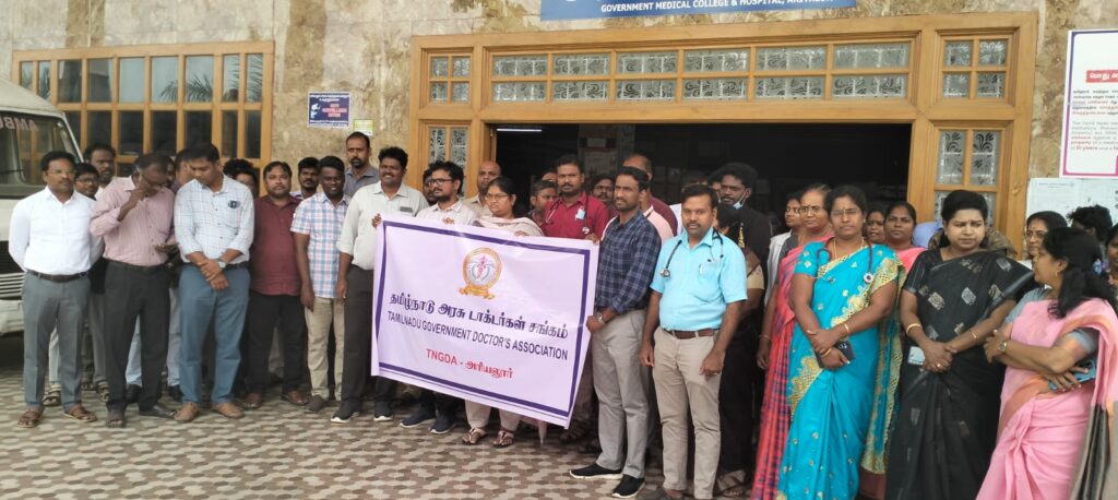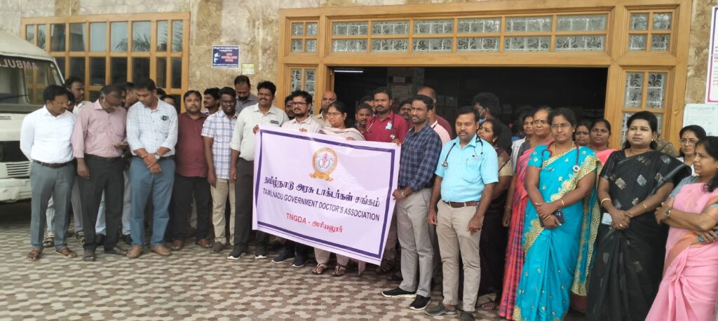 அரியலூர் அரசு மருத்துவக் கல்லூரி மருத்துவமனை வளாகத்தின் முன்பு , தமிழ்நாடு அரசு டாக்டர்கள் சங்கத்தின் அரியலூர் மாவட்ட கிளை சார்பில் பல்வேறு கோரிக்கைகளை வலியுறுத்தி கவனியீர்ப்புஆர்ப்பாட்டம்நடைபெற்றது.