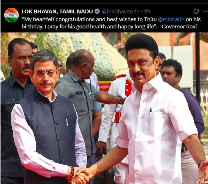 இந்நிலையில் தமிழக ஆளுநர் ஆர்.என். ரவி பிறந்த நாள் முதல்வர் மு.க. ஸ்டாலினுக்கு, தனது வாழ்த்துகளைத் தெரிவித்துள்ளார்.