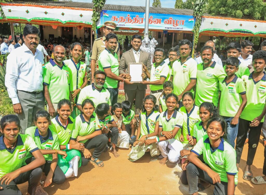 மதுரை மாவட்டம் ஆயுதப்படை மைதானத்தில் நடைபெற்ற 79வது சுதந்திர தின விழாவில் பசுமை பணிகளை தொடர்ந்து செயல்படுத்தி வரும் யானைமலை ஒத்தக்கடையை சேர்ந்த தலைமை ஆசிரியர் தென்னவன் தலைமையிலான