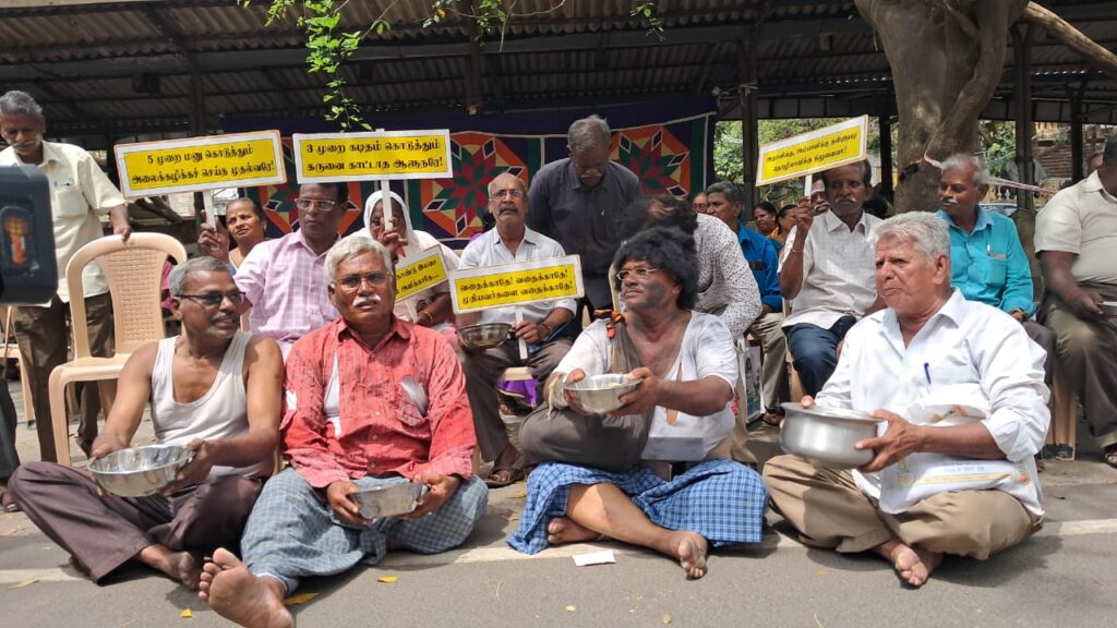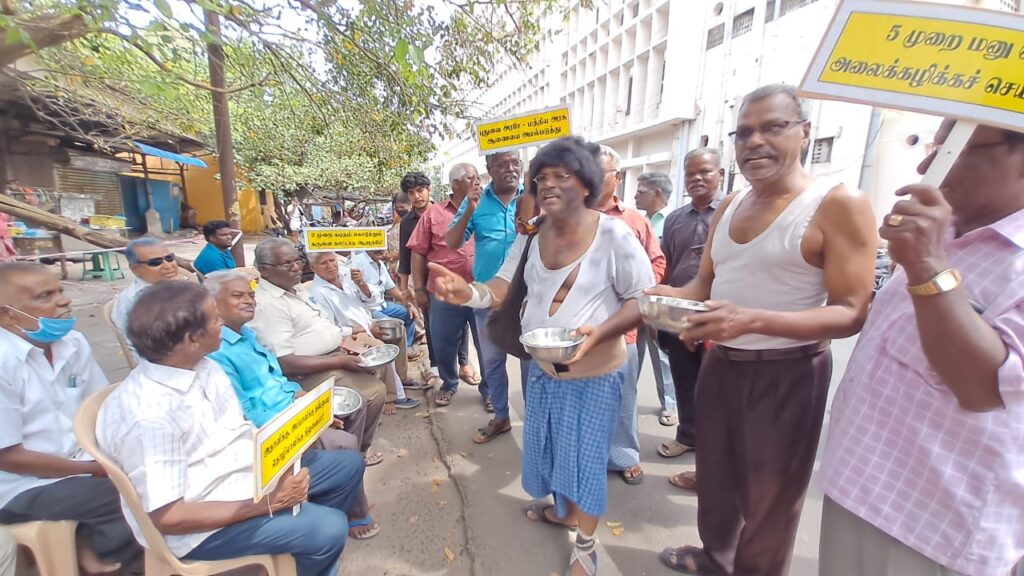 சங்க பொதுச் செயலாளர் பக்தவச்சலம் தலைமையில் நடைபெற்ற பிச்சை எடுக்கும் நூதன போராட்டத்தில் சுமார் 100-க்கும் மேற்பட்ட ஓய்வு பெற்ற சுகாதாரத்தை ஊழியர்கள் கையில் தட்டு ஏந்தி சாலையில் செல்லும் பாதசாரிகளிடமும் பொதுமக்களிடமும் பிச்சை எடுத்து நூதன போராட்டத்தில் ஈடுபட்டனர்.