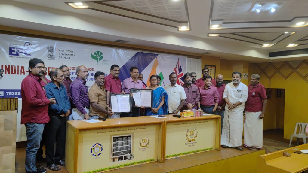 மதுரை தமிழ்நாடு சேம்பர் மெப்கோ அரங்கில் நடைபெற்ற EPC & APEDA இணைந்த கருத்தரங்கில், இந்தியா–இங்கிலாந்து சுதந்திர வர்த்தக ஒப்பந்தத்தின் (FTA) பின்னணியில், இந்தியா ஏற்றுமதி மேம்பாட்டு மையமான EPC மற்றும் தமிழ்நாடு அப்பளம் வடகம் மோர் வத்தல் சங்கம் (AVM) இணைந்து வரலாற்று சிறப்புமிக்க புரிந்துணர்வு ஒப்பந்தம் (MoE) கையொப்பமிடப்பட்டது.