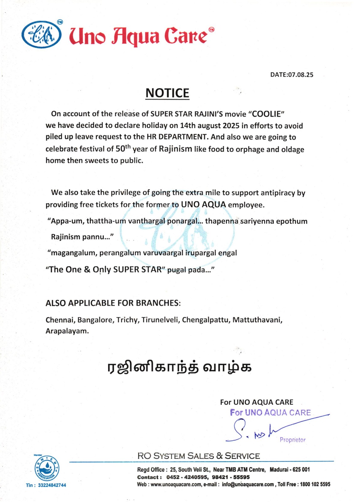 மேலும், UNO AQUA நிறுவன பணியாளர்களுக்கு இலவச திரைப்பட டிக்கெட் வழங்கும் சிறப்புரிமையையும் மேற்கொள்கிறோம். “அப்பாவும், தாத்தாவும் வந்தார்கள், போனார்கள்… தப்பென்ன, சரியென்ன — எப்போதும் ரஜினிசம் பண்ணு. “மகன்களும், பேரன்களும் வருவார்கள், இருப்பார்கள் – எங்கள் “The One & Only SUPER STAR” புகழ் பாட..” என்றும், தெரிவித்து., சென்னை, பெங்களூரு, திருச்சி, திருநெல்வேலி, செங்கல்பட்டு, மாட்டுத்தாவணி, ஆரப்பாளையம் என அவர்களின் பல்வேறு கிளைகளுக்கும் விடுமுறை அளிப்பதாக தனது சுற்றறிக்கையில் குறிப்பிட்டுள்ளது.