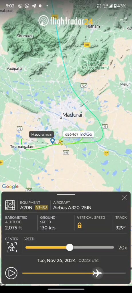 மதுரை விமான நிலையத்தில் மேக மூட்டம் காரணமாக வானில் வட்டமடிக்கும் ஹைதராபாத் இன்டிகோ விமானம். ஹைதராபாத்தில் இருந்து மதுரை வந்த இண்டிகோ விமானத்தில் 170 பயணிகள் பத்திரமாக தரையிறக்கினர்.