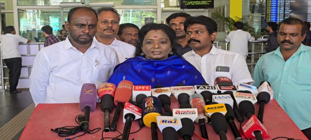 வாரணாசியில் தனது தந்தைக்கு அஸ்தியை கரைத்து விட்டு, சென்னை விமான நிலையத்தில் வருகை புரிந்த தமிழக பாஜக முன்னாள் தலைவர் தமிழிசை சௌந்தரராஜன் செய்தியாளர்களை சந்தித்தார்.