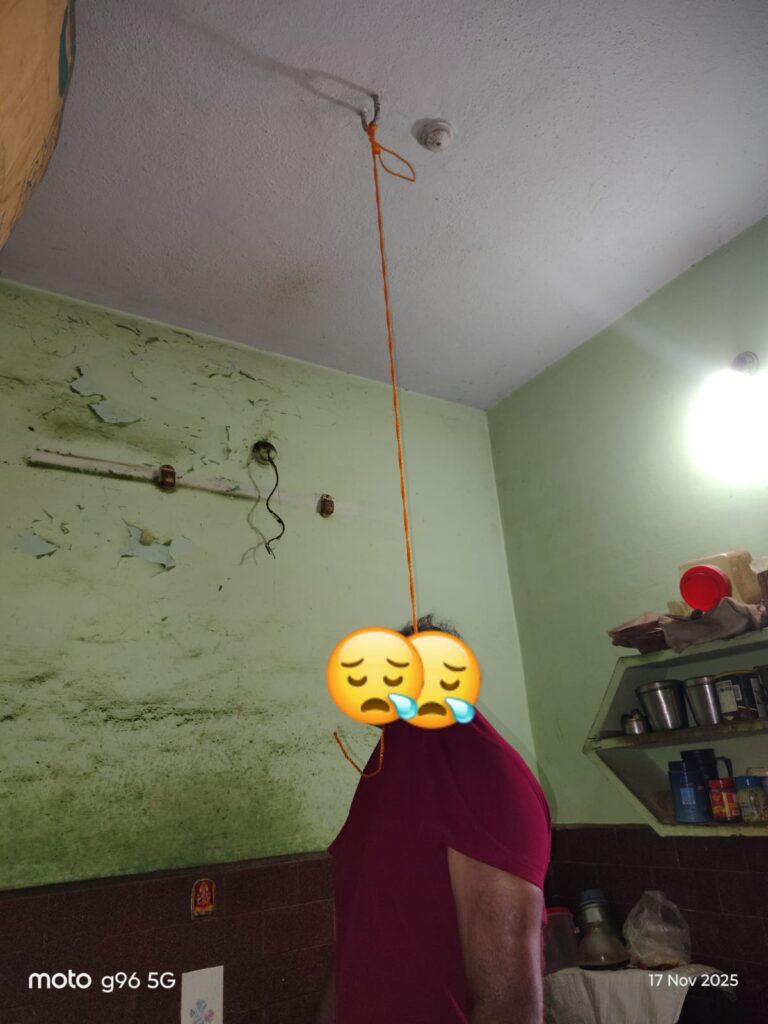 இவர்களது மகள் மணிமேகலை திருமணம் முடித்து அருகிலேயே வசித்து வருகிறார். இன்று காலை மணிமேகலை தனது குழந்தைகளை அருகில் உள்ள பள்ளிக்கு அனுப்பிவிட்டு தனது தாயார் வீட்டிற்கு வந்துள்ளார். அப்போது கதவைத் தட்டியும் திறக்காத நிலையில் ஜன்னலில் இருந்து பார்த்த போது கந்தசாமி தூக்கில் தூங்கி நிலையில் இருந்துள்ளார். அதனையடுத்து அருகில் உள்ளவர்களை அழைத்து வீட்டில் சென்று பார்த்த போது கந்தசாமி தூக்கில் தொங்கிய நிலையில் உள் அறையில் யோகாம்பிகை தலையில் அடிபட்டு ரத்த வெள்ளத்தில் இருந்துள்ளார்.
