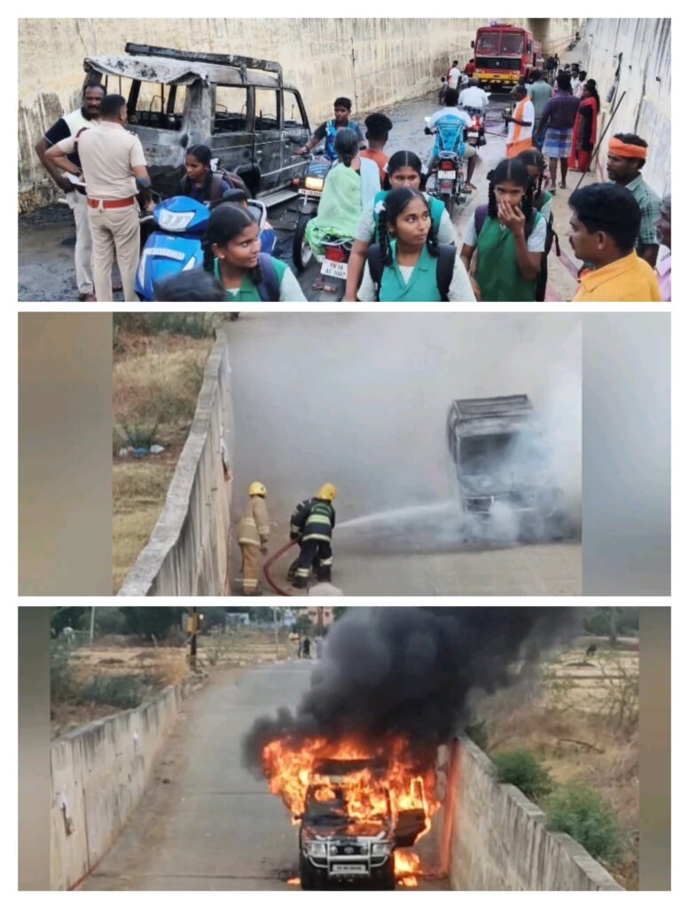 அவ்வாறு வழக்கம் போல இன்று பள்ளி முடிந்ததும், பள்ளி மாணவ மாணவிகளை கட்டக்கருப்பன்பட்டியில் இறக்கிவிட்டு 6 மாணவ மாணவிகளுடன் பொட்டுலுப்பட்டி திரும்பிக் கொண்டிருந்த போது போலிபட்டி அருகில் மதுரை போடி இரயில்வே பாலத்தின் அடியில் வந்த கார் திடீரென தீப்பற்றி எரிந்தது.