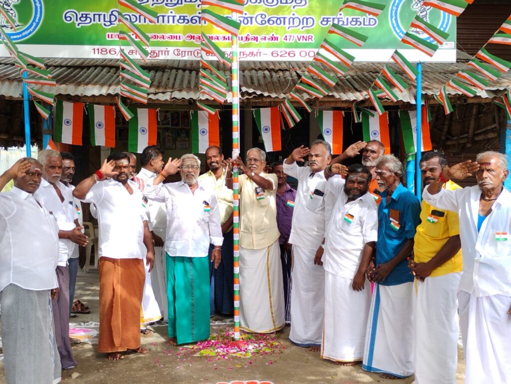 விருதுநகரில் உள்ள சுமை பணியாளர்கள் தலைமை சங்க அலுவலகத்தில் 79வது சுதந்திர தின விழா கொண்டாடப்பட்டது. சுமை பணியாளர்கள் சங்க மாவட்ட செயலாளர் பிச்சை கனி தேசிய கொடி ஏற்றி வைத்து மரியாதை செலுத்தினார். நிகழ்ச்சியில் சங்கத்தின் தலைவர் டேவிட், செயலாளர் விஜயகுமார், பொருளாளர் நாகசுந்தரக்கண்ணன், மற்றும் நிர்வாகிகள் கலந்து கொண்டனர்.