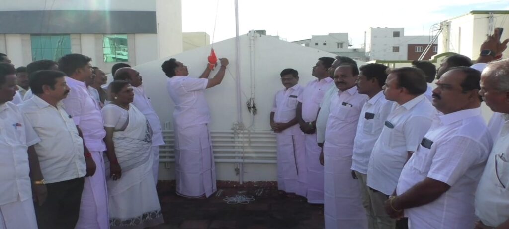 கரூர் மாநகரில், பழனியப்பா நகரில் உள்ள அதிமுக மாவட்ட கட்சி அலுவலகத்தில் இன்று 79 ஆவது சுதந்திர தின விழாவை முன்னிட்டு முன்னாள் போக்குவரத்துறை அமைச்சரும், கரூர் மாவட்ட அதிமுக செயலாளருமான எம்.ஆர்.விஜயபாஸ்கர் கொடிக்கம்பத்தில் தேசிய கொடி ஏற்றி வைத்து இனிப்புகள் வழங்கி கொண்டாடப்பட்டது.