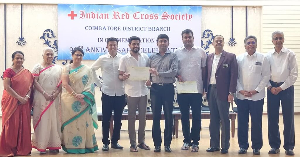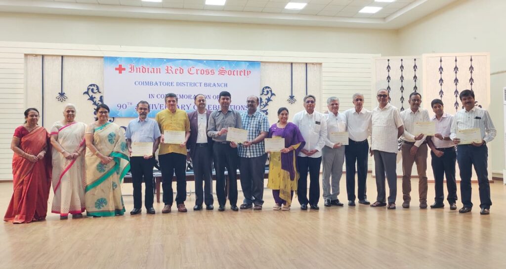 இந்திய செஞ்சிலுவை சங்கத்தின் 90 வது ஆண்டு விழாவை முன்னிட்டு கோவையில் சமூக பணியில் ஈடுபட்டு வரும் தன்னார்வல பள்ளி கல்லூரி மாணவர்கள் மற்றும் ஆசிரியர்கள் பாராட்டு சான்றிதழ் வழங்கி கவுரவிக்கப்பட்டனர்..