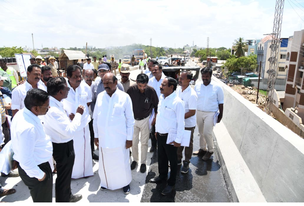 மதுரை மாவட்டம், பொதுப்பணித்துறை, நெடுஞ்சாலைகள் மற்றும் சிறு துறைமுகங்கள் துறைஅமைச்சர் எ.வ.வேலு வணிகவரி மற்றும் பதிவுத்துறை அமைச்சர் பி.மூர்த்தி ஆகியோர் நெடுஞ்சாலை துறை சார்பில் கோரிப்பாளையம் மற்றும் அப்பல்லோ ஆகிய சந்திப்புகளில் மேம்பாலம் கட்டப்பட்டு வரும் பணிகளை ஆய்வு செய்து பார்வையிட்டனர்.