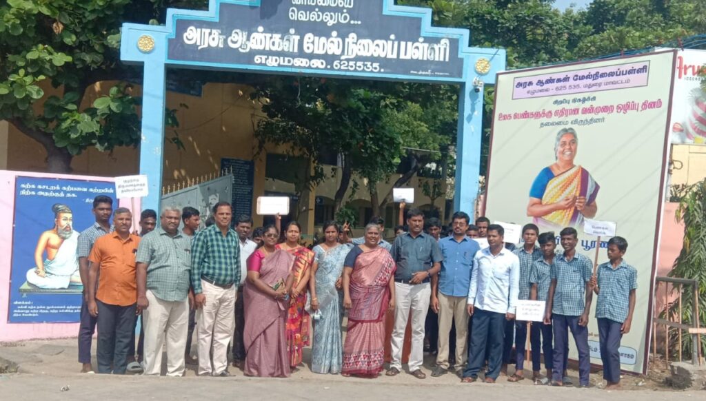 மதுரை மாவட்டம், எழுமலை அரசு ஆண்கள் மேல்நிலைப் பள்ளியில் உலக பெண்களுக்கு எதிரான வன்முறை ஒழிப்பு தின நிகழ்ச்சி மற்றும் விழிப்புணர்வு பேரணி தலைமையாசிரியர் தனபால் முன்னிலையில் நடைபெற்றது.