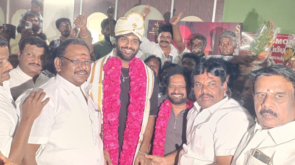 கேப்டன் விஜயகாந்த் மகன் சண்முக பாண்டியன் கதாநாயகனாக நடித்துள்ள கொம்பு சீவி திரைப்படம் தமிழகம் முழுவதும் உள்ள திரையரங்குகளில் வெளியாகி உள்ளது.அதன் ஒரு பகுதியாக கோவை ரயில் நிலையம் அருகே உள்ள சாந்தி திரையரங்கில் படத்தைக் காண சண்முக பாண்டியன் மற்றும் படக்குழுவினர் வருகை தந்தனர்.சண்முக பாண்டியனை தேமுதிக தொண்டர்கள் மற்றும் ரசிகர்கள் உற்சாகமாக ஜமாப் அடித்து, பட்டாசு வெடித்தும்,ஆராத்தி எடுத்தும் வரவேற்றனர்.