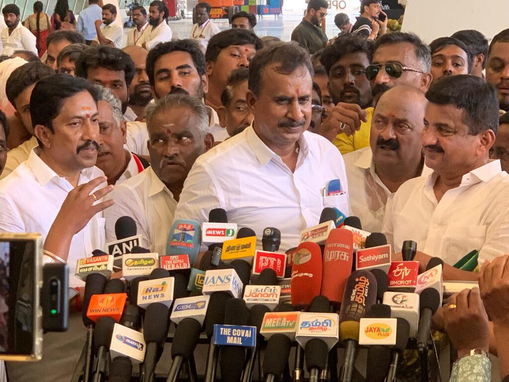 கோவை விமான நிலையத்தில் அனைத்திந்திய அண்ணா திராவிட முன்னேற்றக் கழகத்தின் முன்னாள் அமைச்சர் எஸ்.பி. வேலுமணிக்கு கட்சித் தொண்டர்கள் இன்று உற்சாக வரவேற்பு அளித்தனர். வேட்பாளர்கள் அறிவிக்கப்பட்டுள்ள நிலையில் கோவை வந்த அவரை, கோவை மாவட்டத்தில் போட்டியிடும் எட்டு அதிமுக வேட்பாளர்களும் தங்களது ஆதரவாளர்களுடன் சேர்ந்து வரவேற்றனர்.