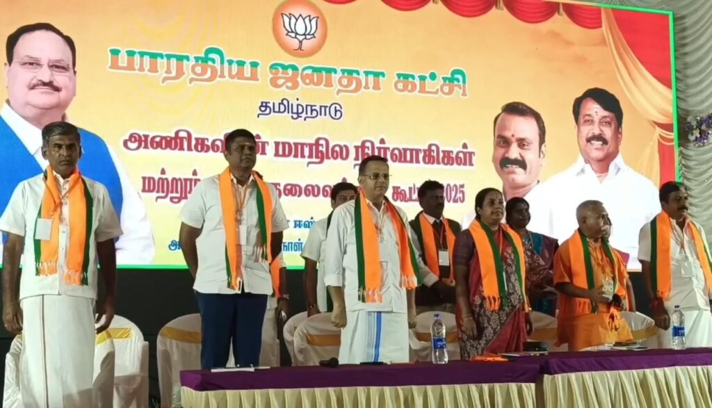 திண்டுக்கல் மாவட்டம் பழனியில் பாரதிய ஜனதா கட்சியின் புதிய 7 அணிகளுக்கான அணி நிர்வாகிகள் அறிமுக கூட்டம் தனியார் மண்டபத்தில் நடைபெற்றது. இதில் பாஜக மாநில தலைவர் நாகேந்திரன், தேசிய மகளிர் அணி தலைவி வானதி சீனிவாசன் , கேடி ராகவன் ,மாநில இளைஞரணி தலைவர் எஸ் ஜி சூர்யா மாநில மாநில தலைவி கவிதா உள்ளிட்ட நிர்வாகிகள் கலந்து கொண்டனர் தற்போது செய்தியாளர்களை சந்தித்த பாஜக மாநில தலைவர் நைனா நாகேந்திரன் தெரிவித்ததாவது:-