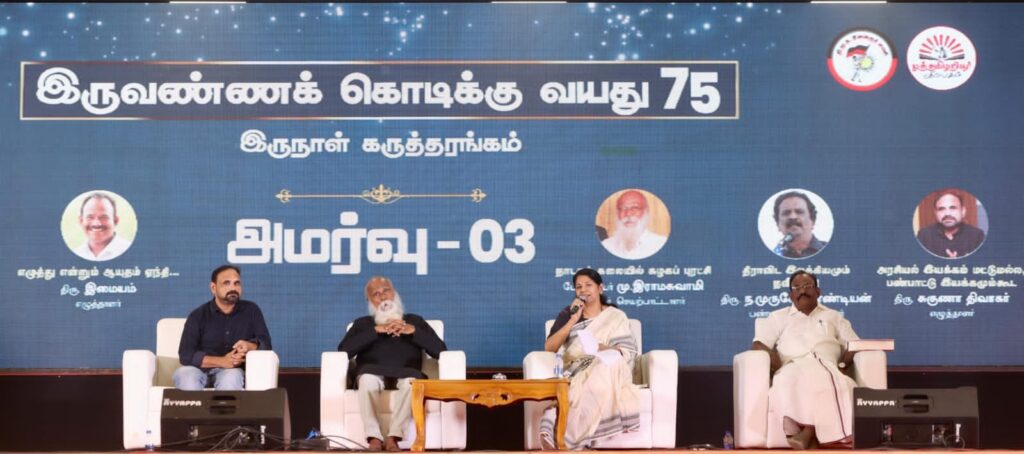 சென்னை வள்ளுவர் கோட்டத்தில், தி.மு.க இளைஞர் அணி செயல்படுத்தும் `தி.மு.க 75 – அறிவுத்திருவிழா’ என்னும் நிகழ்ச்சியை நேற்று (08/11/2025) முதலமைச்சர் மு.க.ஸ்டாலின் ‘காலத்தின் நிறம் கருப்பு சிவப்பு’ நூலை வெளியிட்டு, ‘இருவண்ணக்கொடிக்கு வயது 75’ கருத்தரங்கத்தையும் ‘முற்போக்கு புத்தகக்காட்சி’யையும் தொடங்கி வைத்தார். இருவண்ணக்கொடிக்கு வயது 75’ என்னும் கருத்தரங்கம் பத்து அமர்வுகளுடன் 08/11/25 மற்றும் 09/11/25 ஆகிய இருநாடுகள் நடைபெறுகின்றன.