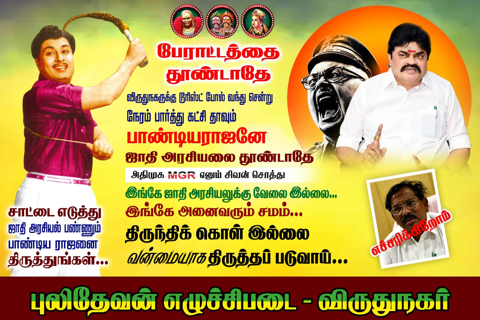 ஆனால், உண்மையான தேவரின சமூகத்தினர் தற்போது இந்தப் பிரச்னையில் ஏன் இப்படி மாஃபா அரசியல் செய்கிறார் என்று கொதித்தெழுந்து, புலித்தேவன் எழுச்சிப்படையினர் ‘போராட்டத்தை தூண்டாதே’ ‘விருதுநகருக்கு டூரிஸ்ட் போல் வந்து சென்று நேரம் பார்த்து கட்சி தாவும் பாண்டியராஜனே ஜாதி அரசியலை தூண்டாதே அதிமுக எம்.ஜி.ஆர் எனும் சிவன் சொத்து இங்கே ஜாதி அரசியலுக்கு வேலை இல்லை…இங்கே அனைவரும் சமம். திருந்திக் கொள் இல்லை…வன்மையாக திருத்தப்படுவாய்’ என விருதுநகர் மாவட்டம் முழுவதும் போஸ்டர்கள் ஒட்டப்பட்டுள்ளது. ஆனா, இந்த பிரச்னைக்கெல்லாம் காரணம் யாருன்னா, அகில இந்திய வல்லரசு பார்வர்டு பிளாக் கட்சியின் நிறுவனத் தலைவர் பி.என்.அம்மாவசித்தேவர்தான் என்று கூறத் தொடங்கியதோடு,