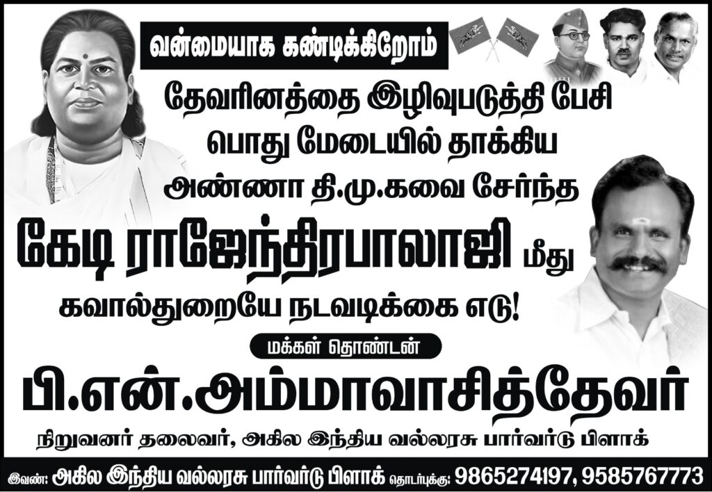 ‘தேவரினத்தை இழிவுபடுத்தி பேசி, பொதுமேடையில் தாக்கிய அண்ணா தி.மு.க.வைச் சேர்ந்த கே.டி.ராஜேந்திரபாலாஜி மீது கவால்துறையே நடவடிக்கை எடு! என்ற போஸ்டரை ஒட்டி, திமுக ஆதரவோடும், மாஃபா பாண்டியராஜன் ஆதரவோடும் கட்சிக்குள் பிரளயத்தை ஏற்படுத்தி வருகிறார். நாங்க எப்பயுமே அண்ணன் எடப்பாடி வழியிலயும், நாங்கள் பெரிதாக மதிக்கிற கே.டி.ராஜேந்திரபாலாஜி வழியிலயும்தான் நடப்போம். எங்க அதிமுக கட்சியில உண்மையான உணர்வுகளோடு அடிமட்டத் தொண்டனா நாடார், தேவர் என அனைத்து சமூக மக்களும் ஒற்றுமையா இருக்காங்க. இவங்க எல்லாரும் மூன்றெழுத்து மந்திரமான எம்.ஜி.ஆரையும், புரட்சித்தலைவி அம்மாவையும் தெய்வமாதான் பார்த்துக்கிட்டிருக்காங்க. சமூகத்தின் பெயரைச் சொல்லி பிரச்னையை விஸ்வரூபமாக்க நினைக்கிறது தப்பு. ஏன்னா, அதிமுக ஜாதிக்கு அப்பாற்பட்ட இயக்கம். முன்னாள் அமைச்சர் மாஃபா பாண்டியராஜன் இந்த ஜாதியை சொல்லி அரசியல் பண்றத நிறுத்திக்கலன்னா பின்விளைவுகள் அவருக்குத்தான். கொடுத்துக் கொடுத்து சிவந்த கரங்களால் ஆரம்பிக்கப்பட்ட கட்சி அதிமுக. இதை நாங்கள் அரசியல் டுடே இணையதள பத்திரிகை மூலம் சொல்லிக்கிறோம் என்றனர் வேகமாக.
